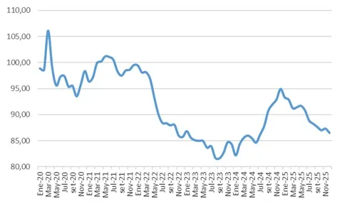 El Índice de Tipo de Cambio Real Efectivo (TCR), elaborado mensualmente por el BCU, permite evaluar la evolución de la competitividad externa del país. En diciembre de 2025, el TCR global cayó 0,9% respecto a noviembre y acumuló una baja interanual de 8,9%, lo que indica una pérdida de competitividad frente al año anterior.