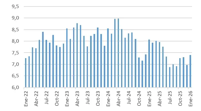 Según el INE, la tasa de desempleo se ubicó recientemente en 7,4%, lo que equivale a unas 142,4 mil personas sin trabajo y en búsqueda activa. El dato implica un ligero aumento de 0,4 puntos porcentuales respecto de diciembre (7%), aunque se mantiene 0,7 puntos por debajo de la cifra registrada en enero de 2025 (8,1%), consolidando así una mejora en la comparación interanual.