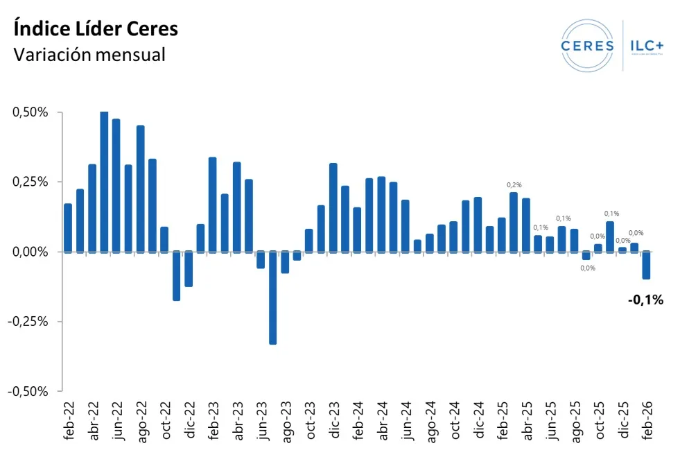 El Índice Líder de Ceres (ILC) tuvo en febrero una baja de 0,1%, lo que marca su primer registro negativo en casi dos años y medio, y reafirman que la economía se encuentra en una etapa de enfriamiento. “Los primeros datos del año de ILC son con tasa neutra en enero y con negativa en febrero, lo que afianza la tendencia negativa que la actividad económica muestra desde el tercer trimestre del año pasado”, señala el informe de Ceres.