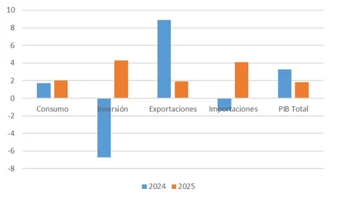 Las exportaciones de bienes y servicios mostraron un menor dinamismo que las importaciones, lo que implicó un deterioro del saldo externo y una menor contribución de la demanda externa neta al crecimiento respecto a 2024. En contraste, tanto el consumo de los hogares como la inversión mostraron una evolución positiva, sosteniendo la actividad a nivel interno.