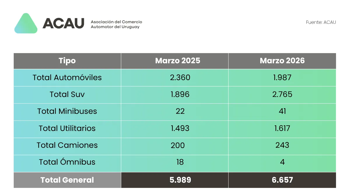 A nivel de segmentos, el crecimiento fue liderado por los SUV, que pasaron de 4.846 unidades en el primer trimestre de 2025 a 7.220 en 2026, ampliando su peso dentro del mercado. Según ACAU, estos vehículos “se siguen despegando del resto”, consolidando un cambio en las preferencias de los consumidores.