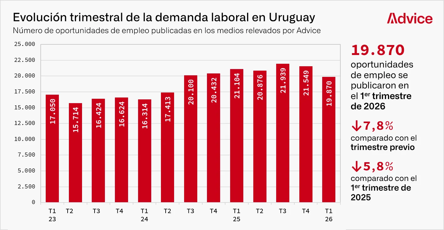 La demanda laboral en Uruguay registró una caída interanual de 5,8% en el primer trimestre de 2026, totalizando 19.870 oportunidades de empleo, según el Monitor Laboral de Advice. El dato implica una reducción de 1.234 vacantes respecto al mismo período de 2025 y marca la primera caída interanual en dos años, interrumpiendo un ciclo de crecimiento que había alcanzado niveles récord el año pasado.