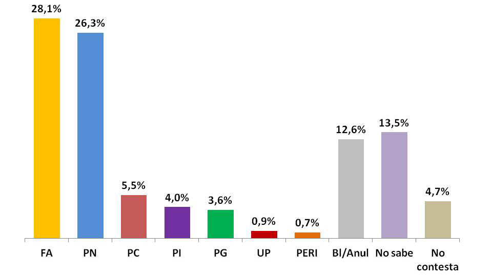 Al mismo tiempo, un 12,6% respondió que votará en blanco o anulado, un 13,5% desconoce a qué partido votará y un 4,7% no emitió respuesta. Además, un 4% dijo que no votará, por lo que fueron eliminados del cálculo.