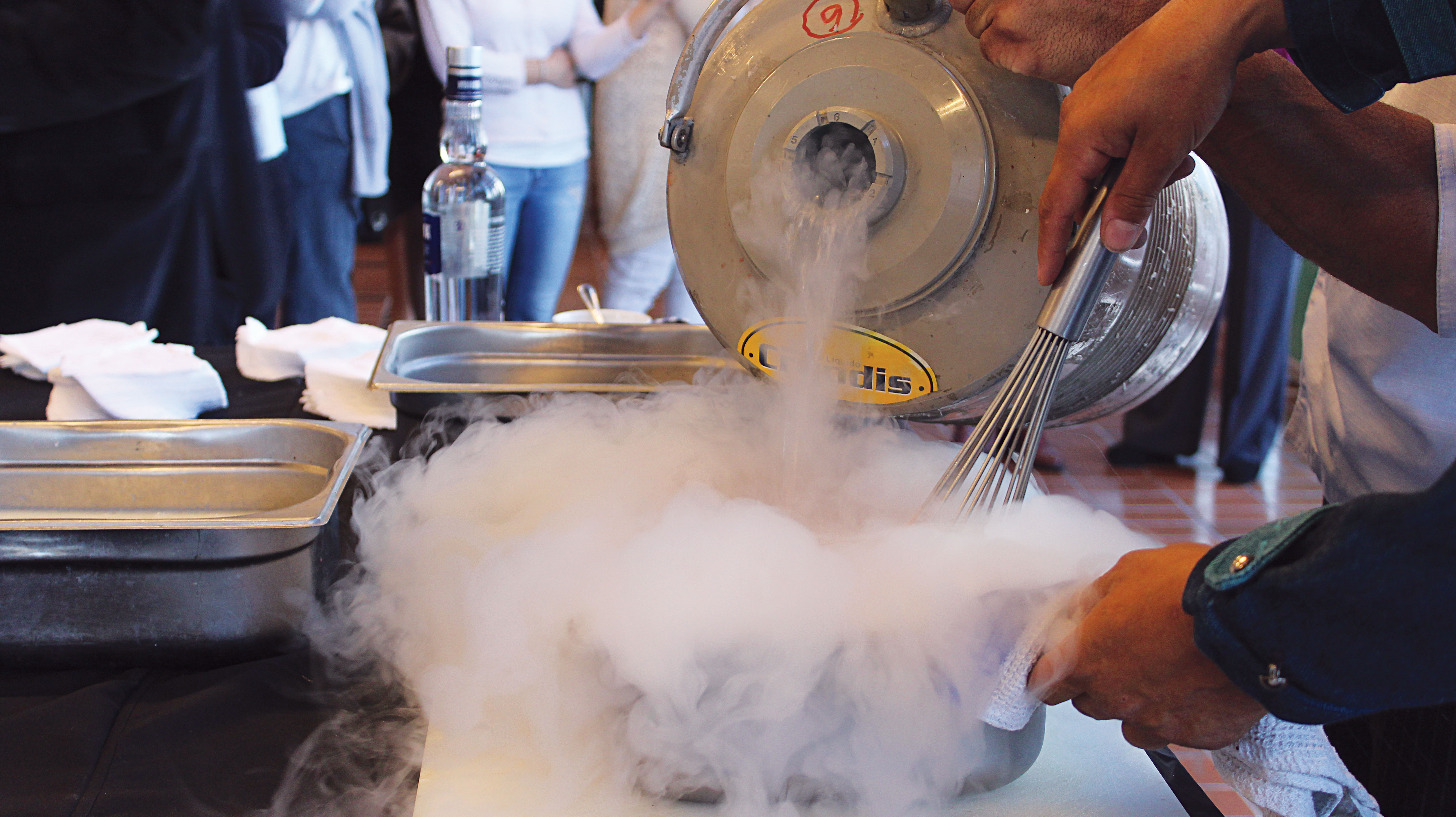 Rafael Carriquiry, chef de profesión, director de la Quinta de Arteaga y fundador de Carriquiry Catering, realizó una demostración de cocina molecular en el LATU, luego del lanzamiento de la Fundación Latitud. En esa ocasión, el chef, junto a su socio, prepararon un daikiri de frutilla y una caipiroska. Ambos tragos contienen bebidas blancas -ron y vodka- que, con métodos tradicionales, no se pueden congelar. Carriquiry y su socio lograron lo que parecía imposible, agregando nitrógeno líquido a ambas preparaciones, hasta transformarlas en helados.